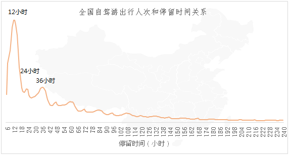2017年上半年全國自駕游出行平均停留時長41小時,且停留時間在12小時、24小時和36小時時,會有明顯的出行人次增加的規(guī)律,其中間隔24小時的增長人次更為明顯,說明人們短途出行習慣性地會以12小時為一個周期進行出行計劃,隔夜游和多日游均遵循這一規(guī)律。