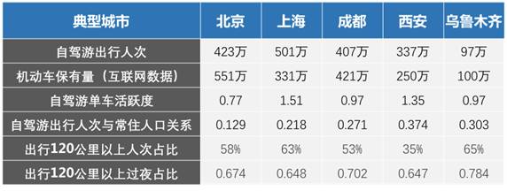 通過對比發現,出行人次基本上反應了五大城市自駕游游客出行的絕對關系。出游人次最多的是上海和北京,最少的是烏魯木齊。同時為了尋找自駕游出游人次和某些客觀因素的相關性時,我們參考了各地的機動車保有量和常住人口。我們發現,當出行人數與機動車保有量的比值越大時,意味著人們出游更多的依賴私家車,從一個側面反映了節假日出游時道路的擁堵程度。我們也可以看出西安是一個自駕游出行更為活躍的城市,因為出行人口相對于西安的人口和機動車保有量而言比值很高,但是大多數出行集中在短途。最后當我們分析出行距離與出行人次和過夜人次的關系時主要反映交通的便利程度是否方便人們在盡可能的時間內返回出發地。烏魯木齊在對比中呈現趨于中長線自駕游的趨勢,其長途出行比例和過夜率均為五城市最高。