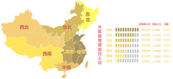 2017年上半年人均自駕出游次數為1.4次。從全國七大經濟區出游人次來看,華東、華中、華北地區的出游人次分別占據全國出游總人次的前三名,西部及北部地區則排名靠后。從宏觀角度講,我們假設這與省份、人口、經濟發展水平甚至城際公路建設有著密不可分的關系。