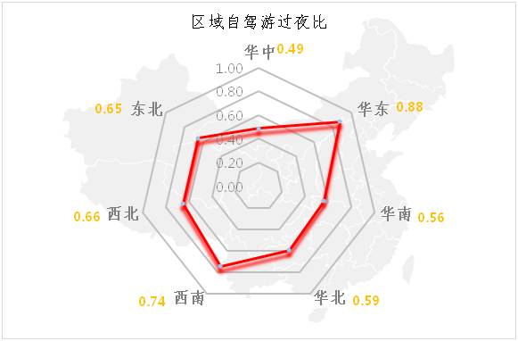 以看出華東地區過夜比例普遍偏高,這與自駕出游活躍度、區域經濟及旅游基礎設施有著密不可分的聯系。過夜比例高,一方面意味著游客有更多機會產生消費行為,另一方面也可能反映出基礎設施比如交通和旅游資源分散等原因造成旅行效率不高,因此加強旅游設施建設,豐富旅游資源,合理設置消費環境提升游客在停留時間的旅游收入應該是當地政府更為關心的內容。